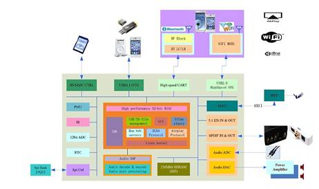 該芯片集成了2.0 High SpeedUSB控制器(內(nèi)置PHY), SD/MMC/SDIO控制器,100M以太網(wǎng),高速UART,Audio ADC和DAC,5.1 I2Sin/out和SPDIF in/out等音頻接口,內(nèi)置了RTC,A/D模塊和UART/SPI Master/I2C/PWM接口,并采用先進的SMIC 0.11G工藝,100-PIN LQFP封裝,疊封SDRAM,非常適合音樂播放、無線推送和音效處理等多方面的應用。應用信息如下圖所示: