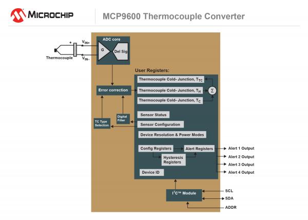 熱電偶廣泛應(yīng)用于工業(yè)、消費(fèi)類、汽車/航空和石油化工等領(lǐng)域的溫度測量。MCP9600為設(shè)計人員提供了世界首個即插即用解決方案,以便打造基于熱電偶的設(shè)計,因為有了MCP9600,就根本無需具備實現(xiàn)分立元件所需的專業(yè)知識,例如使用單片機(jī)的數(shù)學(xué)引擎開發(fā)固件。設(shè)計人員不再需要創(chuàng)造精密儀表電路來準(zhǔn)確測量熱電偶的微伏級信號,也不需要設(shè)計ADC電路來準(zhǔn)確計算溫度。通過MCP9600的集成冷端補(bǔ)償,無需專業(yè)的熱設(shè)計也可通過計算熱電偶的“熱”端溫度來精確測量熱電偶“冷”端的參考溫度。