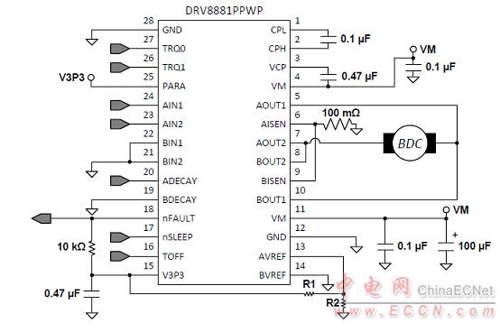 圖5。DRV8881P驅(qū)動(dòng)有刷DC馬達(dá)應(yīng)用框圖