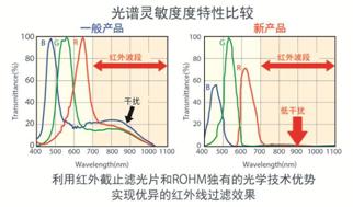 BH1745NUC通過在IC上形成光譜靈敏度特性卓越的濾波器,使傳感器對RGB各波長的干涉更。▓D3)。與一般產(chǎn)品相比,利用優(yōu)異的光譜靈敏度特性,可實(shí)現(xiàn)不受光源種類影響的高精度測量(圖4)。