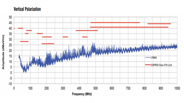 就噪聲敏感型應(yīng)用而言,LT8602 加上一個小型外部濾波器,就可以運用其脈沖跳躍模式最大限度降低開關(guān)噪聲,且可滿足 CISPR25 Class 5 EMI 要求,如圖 2 所示。