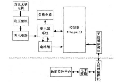 無人機電源管理系統(tǒng)是飛機實現(xiàn)自主飛行的重要組成部分, 其大致框架如圖1 所示。在該系統(tǒng)中, 利用AXI 公司生產(chǎn)的2212/ 34 型號發(fā)電機將動能轉(zhuǎn)換為220V 交流電, 再經(jīng)過整流穩(wěn)壓后輸出11.6V 的直流電壓, 可由該輸出電壓為兩節(jié)鋰電池充電。電源管理系統(tǒng)的控制器是meg a161單片機, 該控制器通過檢測兩節(jié)鋰電池的電壓大小從而控制繼電器開關來對電池進行充放電管理。