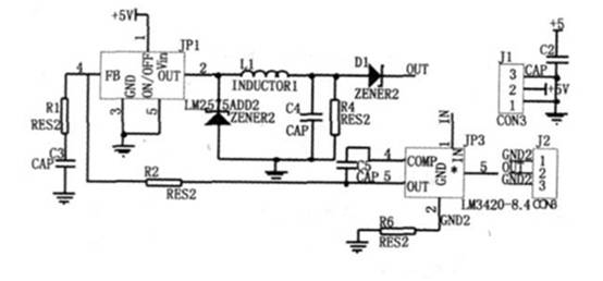 鋰離子電池的充電特性和鎳鎘、鎳氫電池的充電特性有所不同, 鋰離子電池在充電時, 電池電壓緩慢上升, 充電電流逐漸減小, 當電壓達到4.2V 左右時, 電壓基本不變, 充電電流繼續(xù)減小。因此對于改型充電器可先用先恒流后恒壓充電方式進行充電, 具體充電電路如圖4 所示。該電路選用LM2575ADJ 組成斬波式開關穩(wěn)壓器, 最大充電電流為1A.