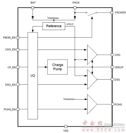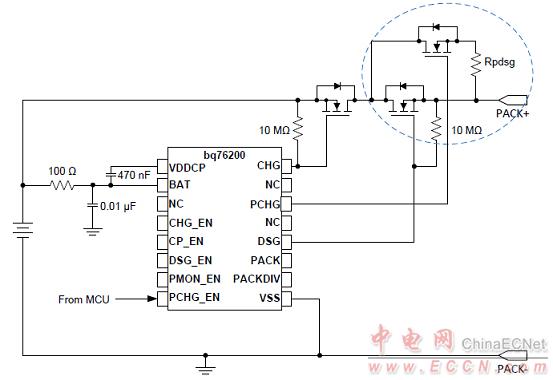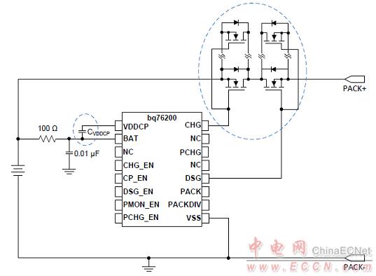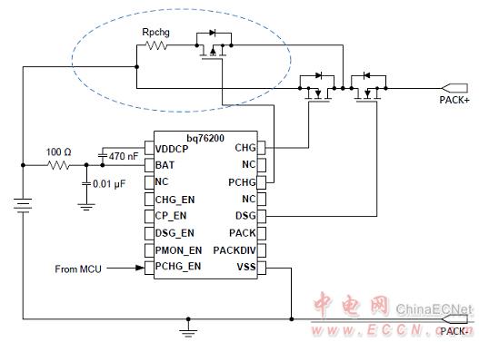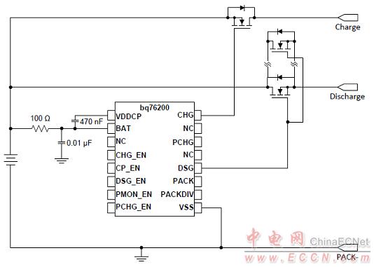 圖3.bq76200簡化應(yīng)用框圖:預(yù)充電的P溝FET和CHG FET并聯(lián)FET