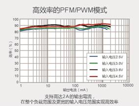 該模式在負(fù)載變動(dòng)時(shí)可自動(dòng)切換PFM和PWM,從而在整個(gè)負(fù)載范圍內(nèi)可實(shí)現(xiàn)達(dá)90%的高效率。非常適用于智能手機(jī)和平板電腦等工作切換頻繁、重視效率的應(yīng)用。