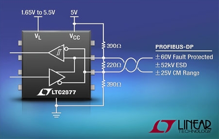 LTC2876 和 LTC2877 提供了多種保護(hù)等級(jí),因而使其成為諸多 PROFIBUS-DP 應(yīng)用的合適之選,包括離散制造和工藝自動(dòng)化。±25V 的擴(kuò)展輸入共模范圍和全面的故障安全操作改善了電噪聲環(huán)境中和存在接地環(huán)路電壓情況下的數(shù)據(jù)通信可靠性,否則會(huì)導(dǎo)致數(shù)據(jù)誤差并有可能損壞器件。該器件非常高的 ESD 保護(hù)等級(jí)可保證 LTC2876 和 LTC2877 能夠在收發(fā)器引腳上承受 ±52kV HBM,并不會(huì)發(fā)生閉鎖或受損;在所有其他引腳上均提供了至 ±15kV HBM 的 ESD 保護(hù)等級(jí)。完全對(duì)稱的接收器門限可確保這些器件維持良好的占空比對(duì)稱性 (在低信號(hào)電平條件下) 和提升接收器抗噪聲能力,同時(shí)支持全面的故障安全操作。這兩款器件皆利用 PROFIBUS IEC 61158-2 和 TIA/EIA-485-A (RS485) 負(fù)載進(jìn)行了測(cè)試,以確保與這兩項(xiàng)標(biāo)準(zhǔn)的兼容性。