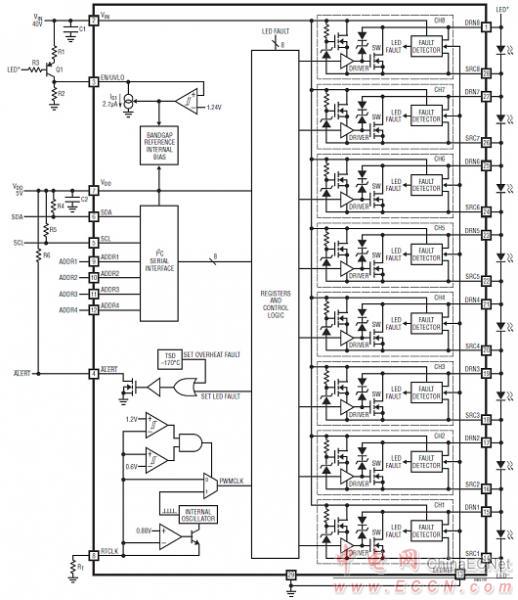 Linear公司的LT3965是八開關(guān)矩陣LED調(diào)光器,具有八個單獨控制的17V/330mΩ NMOS開關(guān),八個開關(guān)可并聯(lián)/或串聯(lián),采用I2C串口和MCU通信,每個開關(guān)可單獨開/關(guān)/調(diào)光1-4個LED,數(shù)字可編程256:1 PWM調(diào)光,主要用在汽車LED頭燈,大型LED顯示屏,自動照相機閃光設(shè)備,RGBW彩色混合照明.本文介紹了LT3965主要特性,框圖和幾種應(yīng)用電路,以及演示板DC2218A特性,測試建立圖,電路圖,材料清單和PCB元件布局圖.