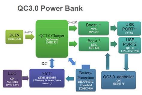 移動電源輸入除適用一般5V適配器外,最大特點是支持QC3.0適配器,讓移動電源本身電池也具備快充功能,最大充電電流更高達4.5A,可于半小時內讓移動電源充電達80%電量。系統(tǒng)中MCU內建程序包含充、放電燈號顯示、電量顯示與相關保護功能。