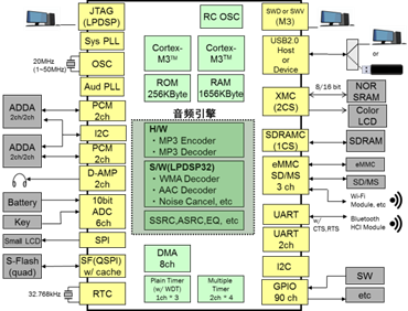 LC823450是音頻處理系統(tǒng)大規(guī)模集成電路(LSI),為其供電的是高能效的ARM® Cortex®-M3核和32位/192 kHz音頻處理引擎,支持基于硬件的MP3編碼/解碼和無線音頻,提升性能和電源能效。LC823450以其充足的片上SRAM(1656k字節(jié)),為音頻處理和應(yīng)用任務(wù)提供大量?jī)?nèi)存,無需配備輔助內(nèi)存芯片。設(shè)計(jì)人員還可利用豐富的集成的音頻外圍器件如模擬/數(shù)字轉(zhuǎn)換器、鎖相環(huán)和D類放大器。此外,行業(yè)標(biāo)準(zhǔn)接口如SPI、I2C、SDCard和UART使產(chǎn)品設(shè)計(jì)人員能內(nèi)置通用連接。
