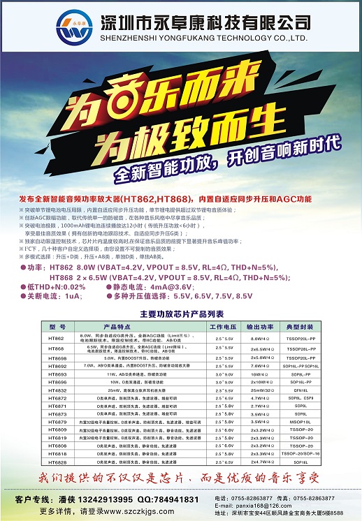 ·I2S數(shù)字功放IC/內(nèi)置DSP音頻算法功放芯片  ·馬達(dá)驅(qū)動IC  ·2.1聲道單芯片D類功放IC  ·內(nèi)置DC/DC升壓模塊的D類功放IC  ·鋰電充電管理IC/快充IC  ·無線遙控方案  ·直流無刷電機(jī)驅(qū)動芯片