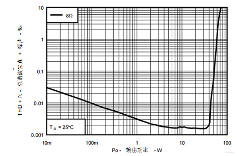 上一代的D級(jí)放大器實(shí)現(xiàn)了0.03% (-70dB)的總諧波失真+噪聲,相比之下,擁有相似輸出功率的AB級(jí)放大器的總諧波失真為0.005% (-86dB),如圖2所示。圖3顯示了同樣的對(duì)比,但它使用了TI最新的高功率D級(jí)放大器。此前,雖然D級(jí)放大器在高功率水平時(shí)的效率要提高大約1.5倍,因此和相似功率的AB級(jí)放大器相比不需要很多散熱,但對(duì)于高清音頻,人們并不會(huì)考慮使用D級(jí)放大器。