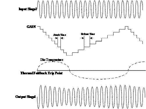 HT862還具有自動(dòng)限溫控制(TFB)功能,在高功率輸出、高環(huán)境溫度等情況下導(dǎo)致芯片片內(nèi)溫度較高時(shí),芯片能自動(dòng)降低系統(tǒng)增益,避免芯片進(jìn)入過(guò)溫關(guān)斷保護(hù)模式,在保證音樂品質(zhì)的前提下顯著提升音樂峰值功率,示意圖如下。設(shè)置修改Attack Time和Release Time能適應(yīng)具有不同散熱條件的系統(tǒng)方案。