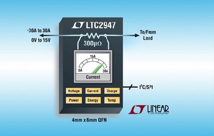 Linear推出針對 0V 至 15V DC 電源軌的功率和能量監(jiān)視器LTC2947。大多數(shù)功率和能量監(jiān)視器 IC 都運用外部檢測電阻器測量電流。然而,選擇檢測電阻器不是一個容易的任務(wù),尤其是在處理大電流時,因為此時所用檢測電阻器可能消耗太多功率、占用大量電路板空間或?qū)y量準確度造成很大影響。LTC2947 集成了一個300µΩ溫度補償檢測電阻器以減輕這些問題,從而為用戶提供一個簡單的24mm2解決方案,以在高達±30A電流提供準確度高達 1.2% 的能量讀數(shù)。當測量 30A 滿標度電流時,LTC2947 集成型檢測電阻器的壓降僅為大約 9mV,產(chǎn)生約四分之一瓦功耗,或在測量6A 電壓軌時產(chǎn)生大約 10mW 功耗。除了低功耗,LTC2947 還具備大動態(tài)范圍,因為其失調(diào)僅為非常小的 6mA (或1.8µV)。