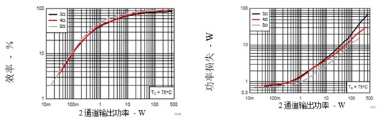 圖1:TPA3251D2電源效率和功率損耗與輸出功率示例