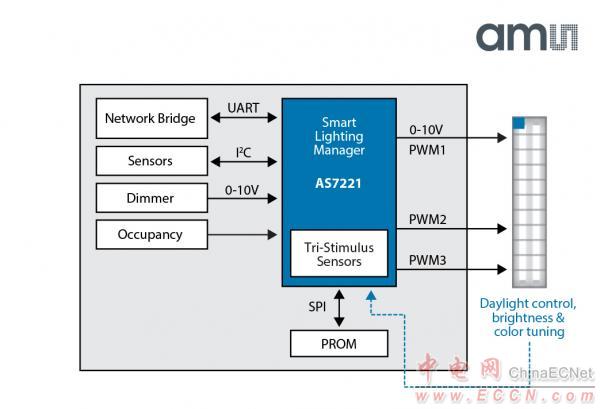 AS7221配備了一個(gè)行業(yè)首創(chuàng)的嵌入式三刺激CIE XYZ色彩傳感器,通過直接映射到CIE 1931色彩空間實(shí)現(xiàn)精確的色彩感應(yīng)。這種智能照明管理器是一種全集成的照明控制系統(tǒng),與標(biāo)準(zhǔn)的0-10V輸入兼容,通過標(biāo)準(zhǔn)的客戶端(如智能藍(lán)牙、ZigBee協(xié)議或WiFi)和完整的智能照明命令集實(shí)現(xiàn)物聯(lián)網(wǎng)連接和網(wǎng)絡(luò)控制,通過直接的PWM通道輸出實(shí)現(xiàn)LED光譜調(diào)諧控制,打造出高精度的解決方案。與更為笨重的分立元件方法相比,這種方案可顯著降低開發(fā)和集成時(shí)間。