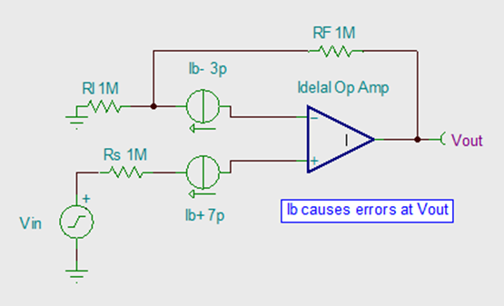 理想情況下,并無電流進入運算放大器的輸入端。而實際操作中,始終存在兩個輸入偏置電流,即IB+和IB-。