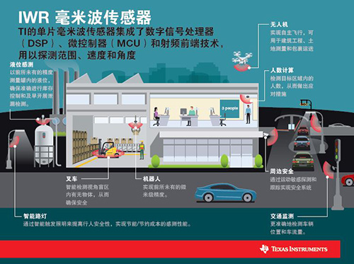 為了應(yīng)對工廠、樓宇自動(dòng)化系統(tǒng)和智能基礎(chǔ)設(shè)施中對于更高效率的需求,開發(fā)人員現(xiàn)在能夠充分利用TI的智能化且穩(wěn)健耐用的毫米波傳感器產(chǎn)品組合。此外,在一些需求不斷增長的應(yīng)用領(lǐng)域,如醫(yī)療設(shè)備、箱內(nèi)液位感測、機(jī)器人視覺和無人機(jī)等,這項(xiàng)感測技術(shù)可用于改造現(xiàn)有的一些功能。TI的IWR1x 毫米波非接觸式傳感器不受環(huán)境中的光照、降雨、灰塵、下霧或霜凍的影響,這使它們在室內(nèi)或室外都能穩(wěn)健運(yùn)行。通過確定設(shè)備周圍物體的所處范圍、速率和角度,這些傳感器能立即適應(yīng)動(dòng)態(tài)變化的場景。