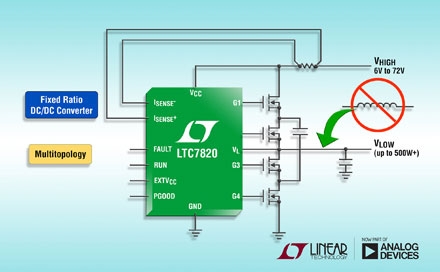 亞德諾半導(dǎo)體 (Analog Devices, Inc.,簡稱ADI) 旗下凌力爾特公司 (Linear Technology Corporation) 推出大功率固定比例充電泵 DC/DC 控制器LTC7820,該器件在非隔離式中間總線轉(zhuǎn)換器中無需功率電感器,從而可將電路尺寸減小多達(dá) 50%,并提供高達(dá)4000W/in3的功率密度。LTC7820 在分壓器、倍增器或反相器配置中以高達(dá) 99% 的效率驅(qū)動(dòng)外部 MOSFET。其開環(huán)固定占空比是非常適合配電、數(shù)據(jù)通信、電信、高端計(jì)算和工業(yè)系統(tǒng)中的非隔離式中間總線應(yīng)用。