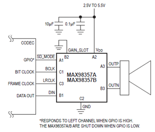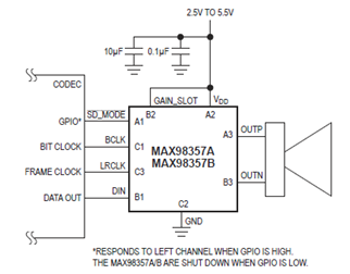 The MAX98357A/MAX98357B are digital pulse-code modulation (PCM) input Class D power amplifiers that provide Class AB audio performance with Class D efficiency. These ICs offer five selectable gain settings (3dB, 6dB, 9dB, 12dB, and 15dB) in I2S/left-justified mode set by a single gain select input and a fixed 12dB gain in TDM mode.