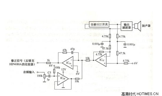 D類功放將音頻信號轉(zhuǎn)變?yōu)閷挾入S信號幅度變化的高頻脈沖,控制功率管以相應(yīng)的頻率飽和導(dǎo)通或截止,功率管輸出的信號經(jīng)低通濾波器驅(qū)動揚聲器發(fā)聲。因功率管大部分時間處于飽和導(dǎo)通和截止?fàn)顟B(tài),功率損耗很小,其效率可達90%以上。典型的D類功放可提供200W輸出,效率達94%,諧波失真在1%~2.8%。