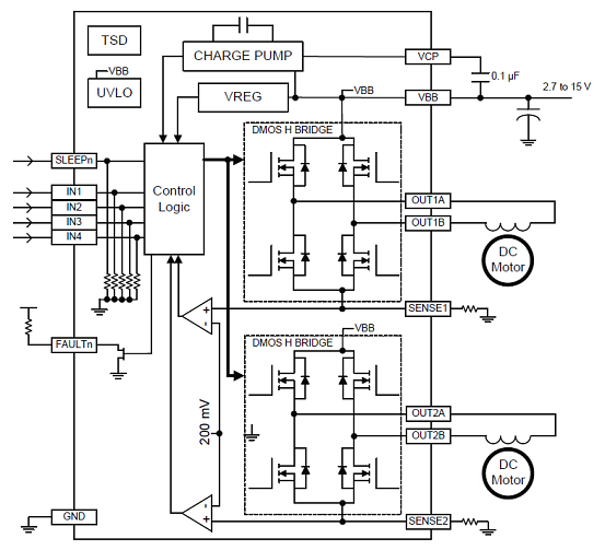 • Dual DMOS full-bridges: drive two DC motors orone stepper motor