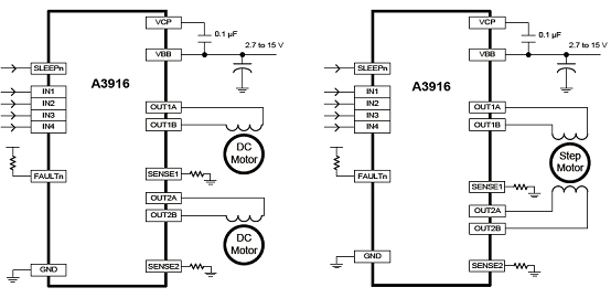 Designed for pulse-width-modulated (PWM) control of lowvoltagestepper motors and single and dual DC motors, theA3916 is capable of output currents up to 1 A per channel andoperating voltages from 2.7 to 15 V.