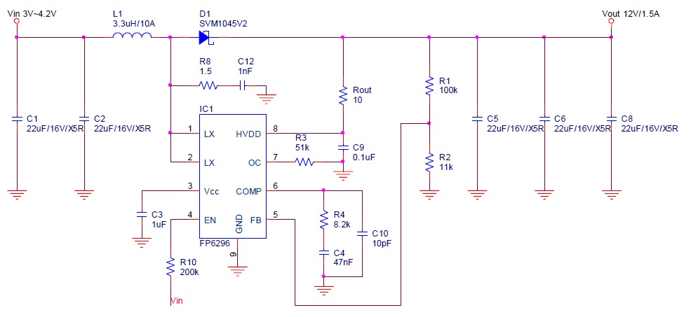 Vin=3.3V、Vout=12V、Iout=1.5A(max)、Fs=400kHz、Eff=88%、r=0.3,代入公式求得電感L=3.217μH,選用3.3μH。
