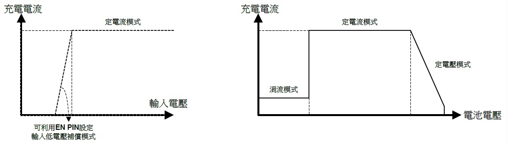 FP8207 充電分成了涓流模式、定電流模式與定電壓模式,另外可利用EN PIN 來設(shè)定輸入電壓調(diào)節(jié)充電電流點(diǎn),避免輸入端(adaptor)功率輸出不夠而導(dǎo)致停止充電,相對(duì)應(yīng)關(guān)係如下圖所示: