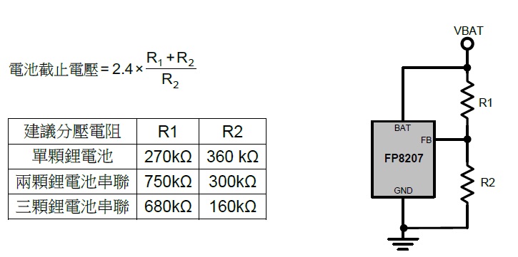 FB PIN 內(nèi)部的參考電壓為2.4V,可藉由外部分壓電阻設(shè)定電池的截止電壓,F(xiàn)P8207 可調(diào)整的截止電壓範(fàn)圍為4.2V~12.6V,可參考下面計(jì)算方法。