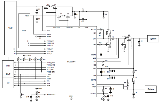 BD99954 includes a Battery Charger, two port BC1.2 detection, a Battery Monitor for voltage, current, temperature andalarm(INT#, PROCHOT#) Controller.