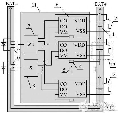 其中:1為單節(jié)鋰離子電池;2為充電過電壓分流放電支路電阻;3為分流放電支路控制用開關器件;4為過流檢測保護電阻;5為省略的鋰電池保護芯片及電路連接部分;6為單節(jié)鋰電池保護芯片(一般包括充電控制引腳CO,放電控制引腳DO,放電過電流及短路檢測引腳VM,電池正端VDD,電池負端VSS等);7為充電過電壓保護信號經(jīng)光耦隔離后形成并聯(lián)關系驅(qū)動主電路中充電控制用MOS管柵極;8為放電欠電壓、過流、短路保護信號經(jīng)光耦隔離后形成串聯(lián)關系驅(qū)動主電路中放電控制用MOS管柵極;9為充電控制開關器件;10為放電控制開關器件;11為控制電路;12為主電路;13為分流放電支路。單節(jié)鋰電池保護芯片數(shù)目依據(jù)鋰電池組電池數(shù)目確定,串聯(lián)使用,分別對所對應單節(jié)鋰電池的充放電、過流、短路狀態(tài)進行保護。該系統(tǒng)在充電保護的同時,通過保護芯片控制分流放電支路開關器件的通斷實現(xiàn)均衡充電,該方案有別于傳統(tǒng)的在充電器端實現(xiàn)均衡充電的做法,降低了鋰電池組充電器設計應用的成本。