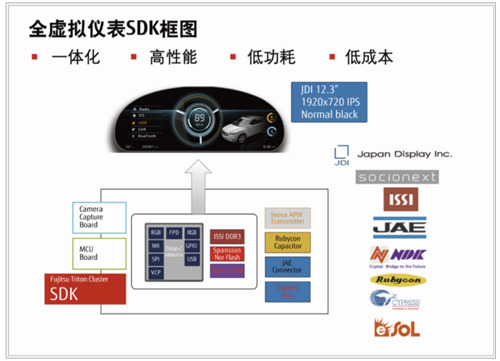 順應(yīng)市場潮流,富士通已推出最新12.3” ,3D全虛擬儀表解決方案。其中主芯片Triton-C是富士通代理產(chǎn)品線——索喜旗下的全虛擬儀表專用圖形處理器,其搭載全球獨(dú)有的強(qiáng)大2D引擎。該方案擁有多達(dá)8層的多層顯示和6路視頻輸入,3路獨(dú)立輸出,并具有專為儀表設(shè)計(jì)的圖形安全功能,能夠符合ISO26262 ASILB安全認(rèn)證。據(jù)悉,該虛擬儀表解決方案已經(jīng)被歐洲主流整車廠如寶馬公司等采用量產(chǎn)。
