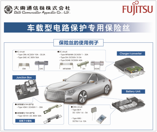 比如新能源汽車興起的今天,汽車動(dòng)力板塊中的高效率直流馬達(dá)和鋰電池應(yīng)用越來越廣泛,繼續(xù)使用傳統(tǒng)的AC用保險(xiǎn)絲已經(jīng)無法可靠地對(duì)直流電路進(jìn)行保護(hù),于是DC用保險(xiǎn)絲成為了選擇。富士通代理產(chǎn)品線——廣泛應(yīng)用于許多國際大廠如豐田、本田等的Daito旗下各種車載型電路保護(hù)專用保險(xiǎn)絲正是覆蓋了這一市場需求,并能以具有競爭優(yōu)勢(shì)的成本提供定制化產(chǎn)品。這些車載型電路保險(xiǎn)絲主要應(yīng)用在汽車接線盒、充電器/轉(zhuǎn)換器、電池單元等功能板塊中,對(duì)于實(shí)現(xiàn)系統(tǒng)小型化、高可靠性至關(guān)重要。
