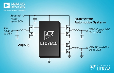 Analog Devices, Inc. (ADI) 宣布推出 Power by Linear™的 LTC7815,該器件是一款高頻 (高達 2.25MHz) 三路輸出 (降壓、降壓、升壓)、同步 DC/DC 控制器,可在汽車冷車發(fā)動情況下將所有輸出電壓保持在穩(wěn)壓狀態(tài)。12V 汽車電池在引擎重新起動或冷車發(fā)動期間會降至低于 4V,因而導致信息娛樂系統(tǒng)和其他依靠 5V 或更高電壓供電工作的電子產(chǎn)品發(fā)生復位。高效率同步升壓型轉(zhuǎn)換器給兩個降壓型轉(zhuǎn)換器饋電,可在汽車電池電壓下降時避免出現(xiàn)輸出電壓壓差,在怠速時關(guān)閉引擎以節(jié)省燃料的汽車啟/停系統(tǒng)中,這是一個有用的特性;蛘撸祲盒涂刂破饕部梢詮囊粋通用型三路輸出控制器的輸入供電。