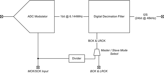如圖 1 所示,高速主時鐘(例如:24.576 MHz 時鐘)用于驅(qū)動 ADC 的過采樣調(diào)制器。之后,來自過采樣調(diào)制器的數(shù)據(jù)被消減分解成 LRCK 給定的采樣速率。