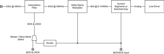 DAC 也是如此。圖 2 顯示了一個高級 DAC 結(jié)構(gòu)圖。此處,需要通過 MCK/SCK 運行內(nèi)插器,而 MCK/SCK 同時還驅(qū)動 △∑ 調(diào)制器。如果 MCK/SCK 不是采樣速率的整倍數(shù) (64/128/256/512),則在 △∑ 調(diào)制器輸出端可能會出現(xiàn)錯誤數(shù)據(jù)。