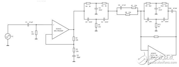 一個(gè)好的ANC耳機(jī)的關(guān)鍵在于濾波器的設(shè)計(jì)。如果濾波器的設(shè)計(jì)不合理,即使再好的ANC芯片也沒用。濾波器設(shè)計(jì)的目標(biāo)是盡量匹配增益和相位響應(yīng)。在特定頻率匹配得越好,ANC性能也就越好。因?yàn)槭悄M信號(hào)處理,濾波器的仿真通常是通過spice仿真工具完成的。圖4是一個(gè)spice仿真線路,該線路體現(xiàn)了ANC麥克風(fēng)濾波器的信號(hào)路徑。