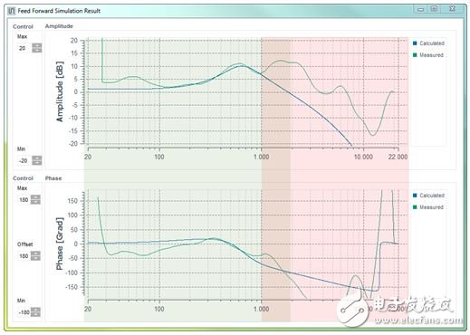 為了解決這一問題,AS3415評(píng)估軟件整合了前饋濾波器仿真工具,如圖5所示。設(shè)計(jì)工程師能夠使用這一工具來設(shè)計(jì)理想的ANC濾波器。這一工具提供了一套預(yù)定義的濾波器架構(gòu),取代了修改零件值及濾波器結(jié)構(gòu)的做法;跒樵S多不同客戶模擬的濾波器結(jié)構(gòu),這些預(yù)定義的濾波器結(jié)構(gòu)能夠涵蓋90%的ANC聲學(xué)需求。圖6顯示了該工具的模擬結(jié)果。綠色曲線代表理想的ANC增益和相位響應(yīng),藍(lán)色曲線顯示了利用圖5的工具制作的ANC濾波器的模擬結(jié)果。設(shè)計(jì)濾波器時(shí),有一點(diǎn)很重要,那就是我們要注重哪些頻段。ANC耳機(jī)的運(yùn)作有特定的頻率范圍,這并非由于AS3415本身的局限性,而是跟聲音的傳播速度及耳機(jī)的聲學(xué)特性相關(guān)。如果我們只關(guān)注理想濾波曲線中的增益響應(yīng),設(shè)計(jì)符合該曲線的濾波器則很容易。但問題是在ANC濾波器的設(shè)計(jì)中也得同時(shí)匹配相位。由于更高頻率下的相位幾乎旋轉(zhuǎn)了180度,設(shè)計(jì)出的濾波器很有可能與頻率響應(yīng)匹配,而不與相位匹配。取決于不同的耳機(jī)及其相位響應(yīng),我們通?梢宰龅1.5kHz頻率以下的濾波器匹配。更高頻的部分需要盡可能的衰減。如果不衰減這些未匹配的高頻部分,可能會(huì)引入噪音。我們?cè)诘皖l部分減弱噪音,但如果高頻的相位失配,就會(huì)導(dǎo)致噪音被放大。為了避免這一現(xiàn)象,我們會(huì)盡量在無法匹配的區(qū)域降低增益。圖6中的綠色透明區(qū)域代表我們通常能達(dá)到的增益和相位的最小失配。紅色區(qū)域是我們要盡量衰減的部分。高頻衰減和相位響應(yīng)之間必須達(dá)到一個(gè)良好的平衡。如果在高頻下衰減得太多,會(huì)影響到低頻的相位響應(yīng),從而可能失去ANC的效果。