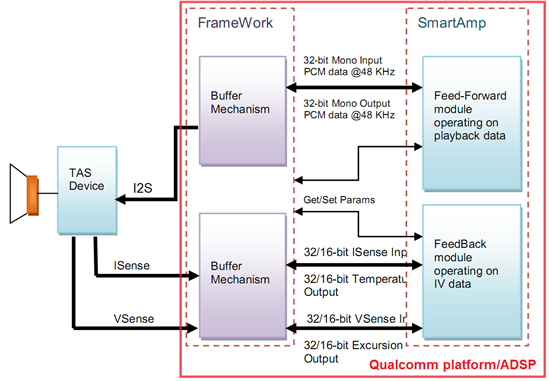 SmartPA主要是通過智能的保護算法實現(xiàn)對喇叭振幅和喇叭溫度的保護,從而充分發(fā)揮喇叭的潛力,在有限的喇叭空間的情況下實現(xiàn)大音量和好音質(zhì)。這一部分TI的解決方案主要包括TAS2557, TAS2560和TAS2559。對于單聲道方案而言,主要是內(nèi)置DSP的TAS2557和不帶DSP的TAS2560。對于內(nèi)置DSP的方案而言,保護算法是跑在芯片內(nèi)部的DSP上,所以實現(xiàn)相對而言更容易。那對于沒有DSP的方案來說,保護算法是需要跑在平臺端的DSP上,那本文主要就是針對這種應(yīng)用,介紹下TAS2560如何在高通平臺上使用。