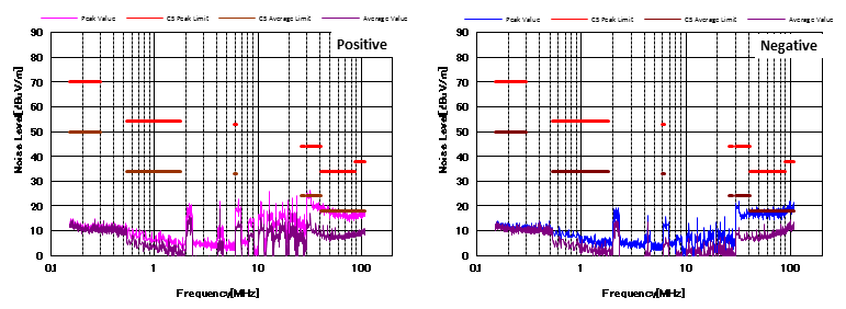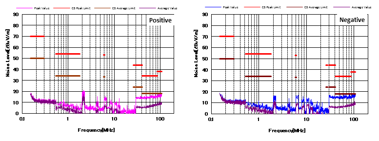 圖4顯示了增加CM和DM濾波器后的噪聲特性。 與圖3相比,CM濾波器的增加降低了近20dBμV/ m的CM噪聲。 并且EMI性能也通過了CISPR25 C5標(biāo)準(zhǔn)。
