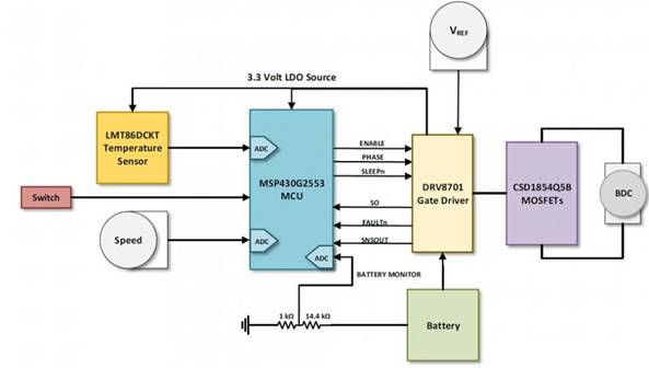 有刷式直流電機參考設計,由DRV8701柵極驅(qū)動器、MSP430G2553IPW20超低功耗微控制器、CSD18540Q5B60V N溝道MOSFET和LMT86DCKT精密CMOS溫度傳感器等器件組成。
