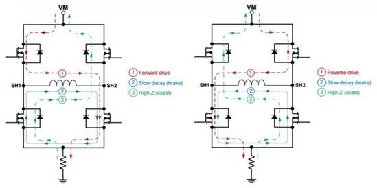 電流方案。在圖中,電機正在初始驅(qū)動,電流從電源中汲取增加。一旦在檢測電阻(VSO)上測得的電壓等于或大于此值,比VREF的SNSOUT引腳被拉低,輸出門信號被切斷該PWM開關間隔的其余部分。在下一個PWM開關間隔的感應在最后一個驅(qū)動循環(huán)中,電機仍然保持一部分電流流過電機在驅(qū)動花費較少的時間駕駛電動機之前,VSO等于VREF和到橋的門信號被切斷。