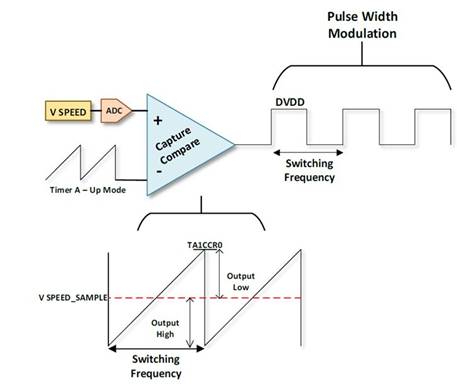用于控制電機的PWM信號是使用MSP430G2553產(chǎn)生的。通過取樣速度電位器的滑動電壓并將該樣本與Timer_A進行比較MSP430的PWM信號具有不同的占空比和恒定的開關頻率創(chuàng)建。