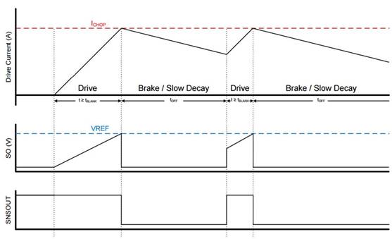 如果VSO大于或等于VREF,則SNSOUT引腳的輸出被拉低指示驅(qū)動器故障,DRV8701正在切斷門信號。而VSO是小于VREF時,SNSOUT引腳的輸出可通過外部上拉電阻拉高至邏輯高電平表示器件工作在典型的驅(qū)動電流狀態(tài)。下面的圖顯示了電流斬波驅(qū)動