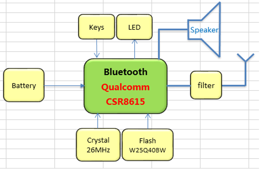 本方案的藍(lán)牙主芯片采用的是Qualcomm的CSR8615,它是一顆ROM版本的藍(lán)牙芯片,藍(lán)牙版本為4.1,內(nèi)置80MHz RISC MCU和80MIPS Kalimba DSP;支持一個(gè)麥克風(fēng)輸入,支持AVRCP、HFP、HSP、AVRCP等常用profiles,支持Wide Band Speech和AAC Decode。由于芯片是ROM方案,開發(fā)者不需要對(duì)其進(jìn)行直接的程序編寫,只需要通過(guò)配置工具進(jìn)行一些配置即可,如配置按鍵控制、配置LED閃爍方式等,因此,對(duì)于開發(fā)者而言,開發(fā)難度相對(duì)較低。配置信息存儲(chǔ)于外置的FLASH中,同時(shí),FLASH也可以存儲(chǔ)一些藍(lán)牙配對(duì)信息以及音箱的一些提示音。方案有一個(gè)專用開關(guān)機(jī)鍵,通過(guò)長(zhǎng)按開機(jī)鍵進(jìn)行開關(guān)機(jī),配有音量加減鍵,直接通過(guò)AVRCP控制音量,同時(shí)還可以通過(guò)按鍵清除配對(duì)信息并讓音箱進(jìn)入可配對(duì)狀態(tài)。