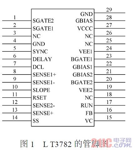LT3782是美國凌力爾特公司生產(chǎn)的兩相步進升壓型DC/DC控制器,28引腳SSOP封裝芯片,開關頻率在150~500kHz之間可編程,由于采用兩相BOOST拓撲結構。對輸出場效應管漏電流和肖特基二極管通過電流的要求都減少一半,即兩個輸出相位差180°,兩個輸出間互相抑制輸出紋波電流,輸出紋波是單相BOOST轉換電路的1/3。電源效率高,對散熱的要求小。圖1是LT3782的管腳圖,第29引腳是芯片底部的散熱腳。27引腳連接輸入電源;4引腳接地;11引腳用來設定開關頻率;20和23BGATE引腳用來驅動場效應管的柵極;8,9,12和13SENSE引腳用來反饋場效應管的輸出電流;16引腳是輸出電壓反饋引腳,該腳電壓為2.44V,通過反饋電阻可以設定輸出電壓值。17引腳是低電壓關斷引腳,當該引腳的電壓大于2.45V時,器件才開始工作,當該引腳的電壓小于0.3V時,器件進入低電壓關斷模式。14引腳是軟啟動引腳,當加電時,輸出電壓從0V漸變到設定的輸出電壓值,典型的啟動時間可以由下式計算: