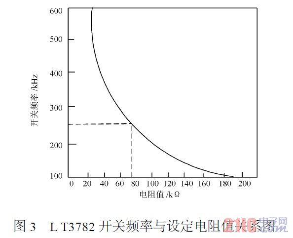 圖2中,電阻R1用來設定LT3782的開關頻率,LT3782的開關頻率在150~500kHz之間可編程。這里選取開關頻率為250kHz,參照圖3取電阻值R1=75kHz。