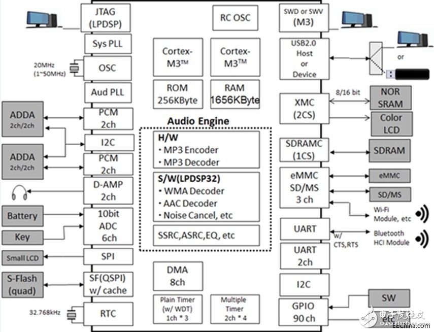它們可以用于耳塞以提供32位、192千赫的性能,并在不大的尺寸范圍內(nèi),采用一個MP3編碼器、解碼器用于MP3、WMA和AAC格式,及一個D類音頻放大器、異步采樣率轉(zhuǎn)換器和一個六波段均衡器。