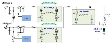 圖1顯示了一種新的USB-C架構(gòu),該架構(gòu)由ISL95338雙向降壓-升壓穩(wěn)壓器和ISL95521A組合式電池充電器或ISL9238降壓-升壓電池充電器組成。這種新架構(gòu)允許系統(tǒng)通過USB-C端口給電池充電,當(dāng)兩個PD充電器插入USB-C_1和USB-C_2時,還支持快速充電功能。無需額外復(fù)雜的端口控制邏輯電路或IC,該架構(gòu)的兩個端口就可全面支持USB 3.1 On-The-Go(OTG)。