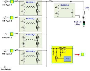 圖3. 實現(xiàn)4個USB-C端口的Intersil電池充電器架構(gòu) - 4個降壓-升壓穩(wěn)壓器+1個降壓充電器